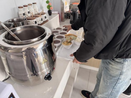 中午時分,食堂窗口前排起長隊。紅棗、紅豆、花生米、蓮子、糯米等十余種食材經過數小時熬煮,化作一碗碗熱氣騰騰的臘八粥迎接員工的到來。廚師們將臘八粥盛到每位員工碗中,員工們接過粥碗,笑容洋溢。