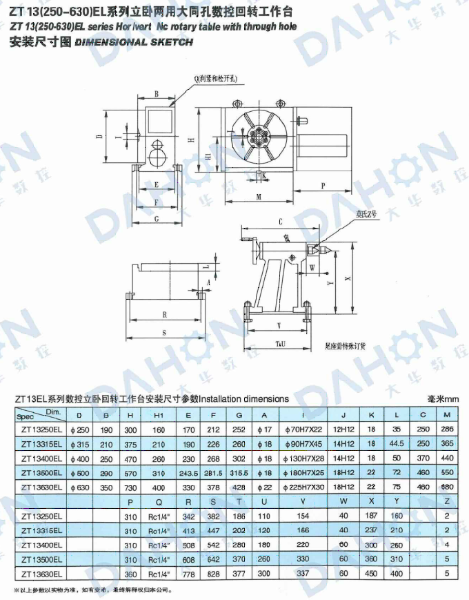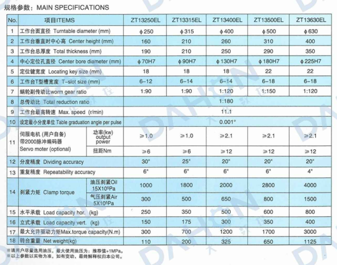 第四軸是各類數(shù)控鏜、銑床和加工中心的關(guān)鍵配套附件,可以主軸垂直和水平兩種方式安裝在主機(jī)工作臺上,用作主機(jī)的第四回轉(zhuǎn)軸。轉(zhuǎn)臺在主機(jī)相關(guān)控制系統(tǒng)控制下, 可實現(xiàn)等分的和不等分的孔、槽或者連續(xù)特殊曲面的加工,且保證很高的加工精度。 ZT 13E series Hor /vert NC rotary table can carry out the performance of direct and indirect dividing plate proc essing, plateslotting and various cam-curving